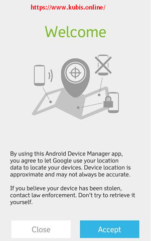 2. Apabila sudah terinstal aplikasinya silahkan anda buka, dan klik Accept. Fungsi utama dari Android Device Manager adalah untuk mengendalikan