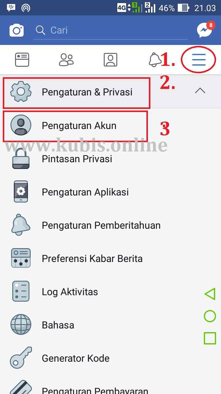 2. Setelah masuk ke akun Fb anda silahkan pilih menu Garis tiga di pojok kanan atas >> Lanjut pilih Pengaturan & privasi