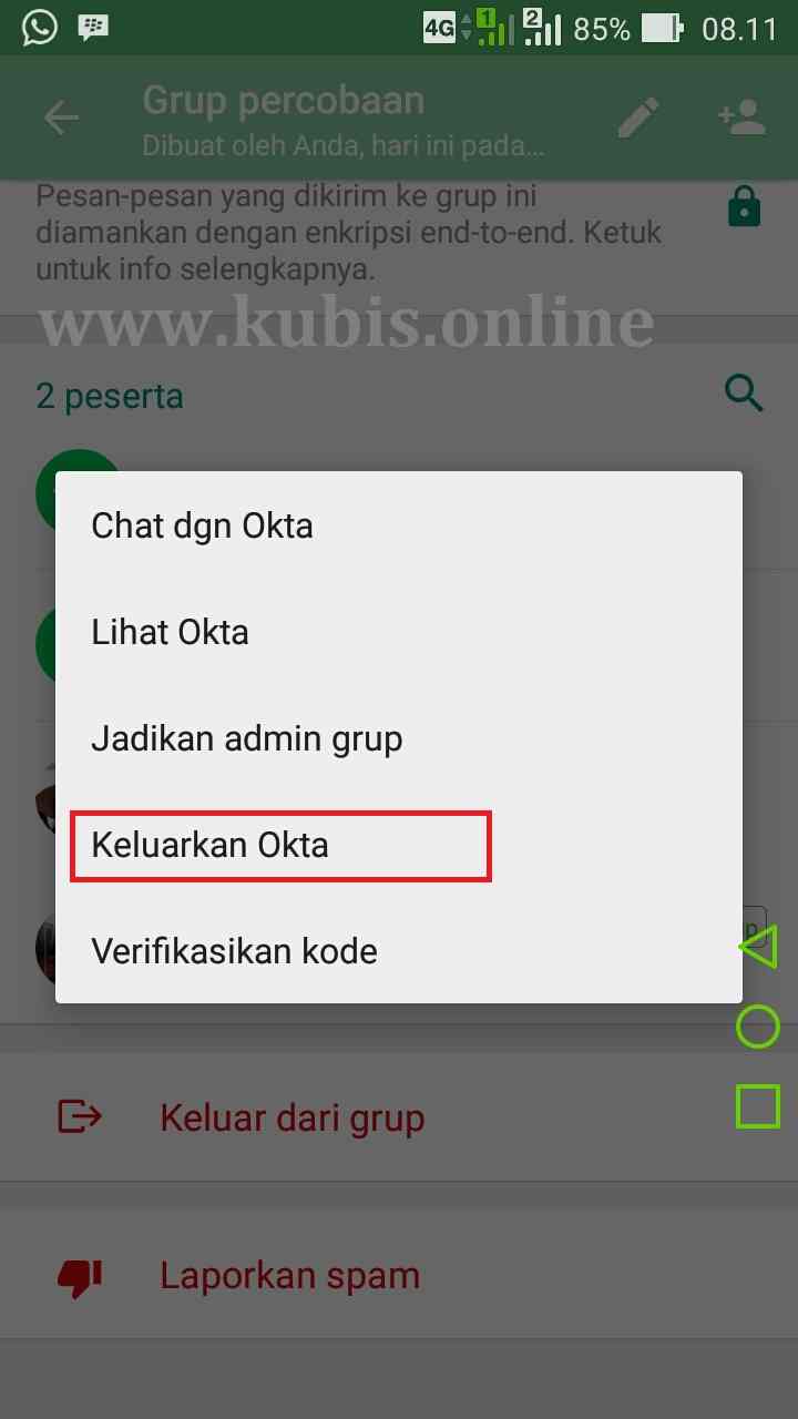 3. Selanjutnya silahkan anda keluarkan semua anggota grup tersebut hingga yang tertinggal hanya admin saja. Caranya >> Buka info grup >> Tap nama peserta >> Keluarkan