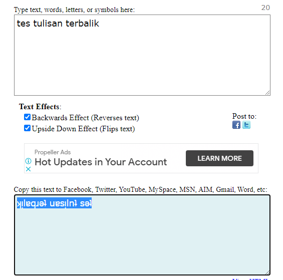 Berbeda halnya dengan membuat tuisan tebal, miring, coret dan tulisan clasic yang hanya dengan menambahkan kode - kode tertentu di awal dan akhir tulisan, untuk membuat tulisan terbalik ini anda tidak perlu melakukan hal tersebut.