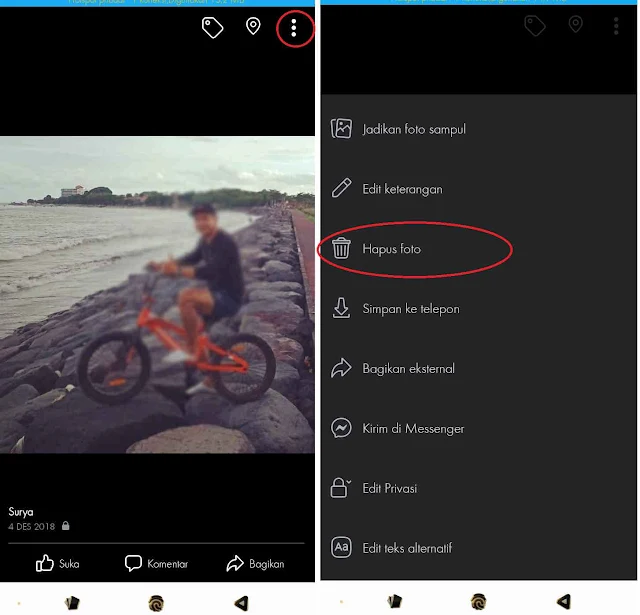 5. Nah disana ada logo titik tiga dibagian atas foto, silahkan anda klik titik tiga tersebut lalu pilih Hapus