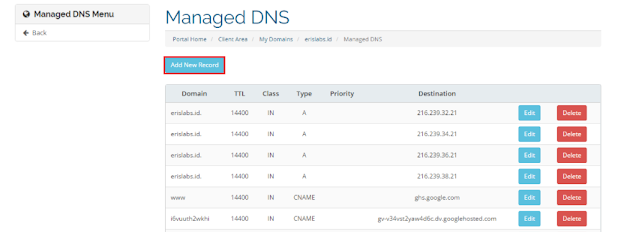 6. Setelah itu anda akan di arahkan ke halaman manage dns, kemudian klik pada add new record
